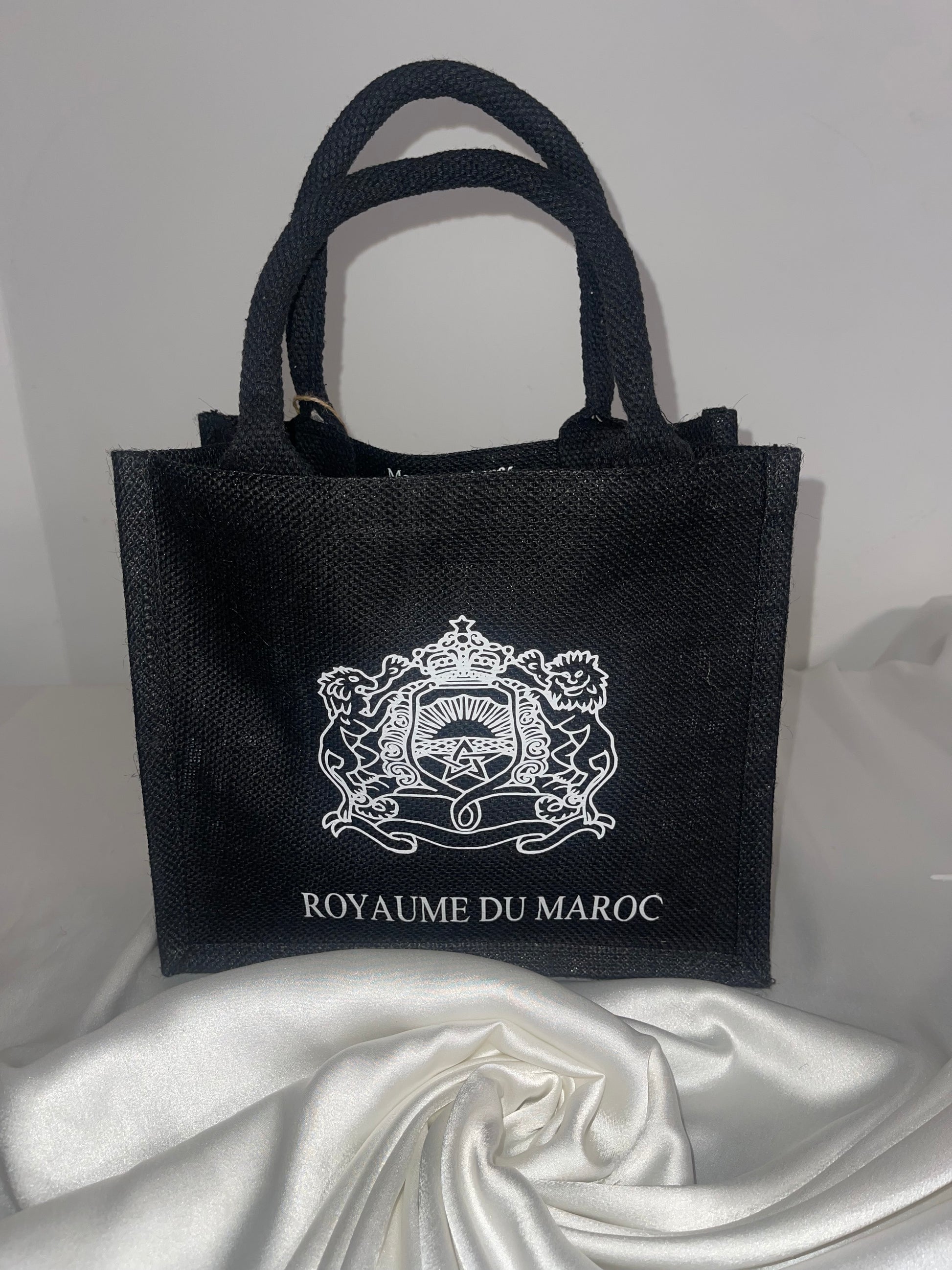 Venez vous procurer notre sac en toile de jute avec son joli blason du Maroc.